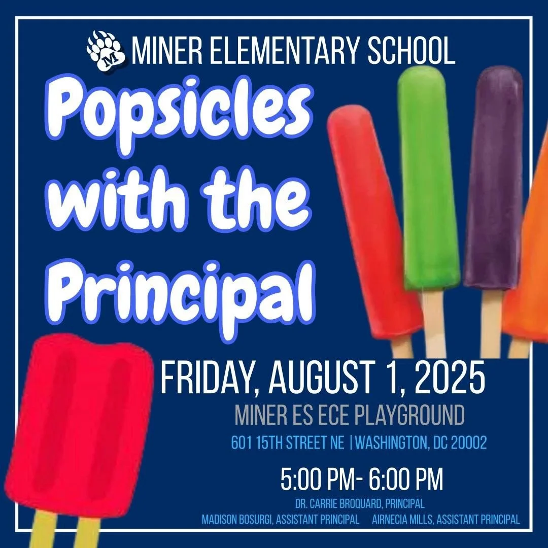 Come meet Principal Dr. Carrie Broquard and connect with Miner teachers, staff, and other families in a relaxed, family-friendly setting. Whether you're new to the Miner community or a returning family, this is a great chance to say hello, ask questions, and enjoy a cool treat together.